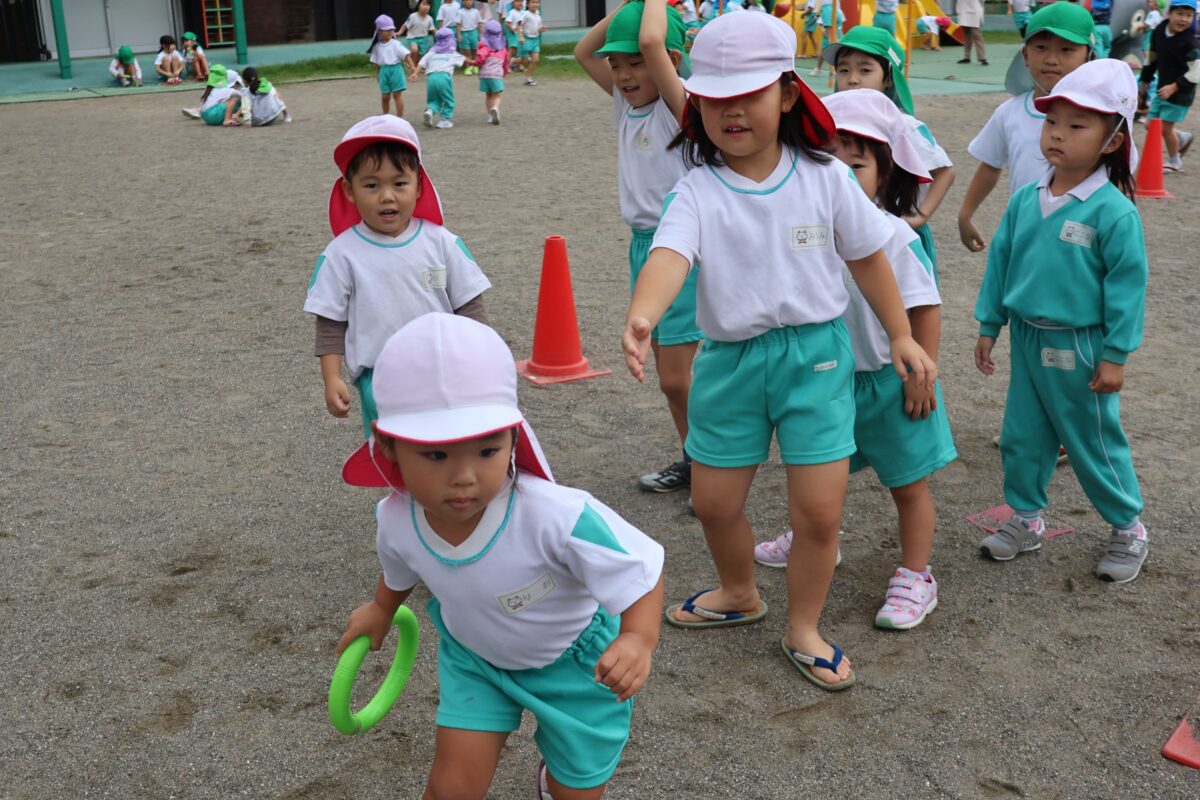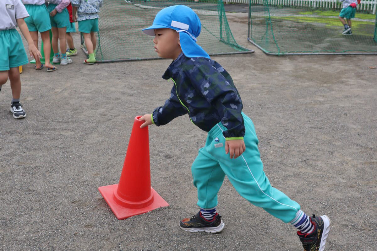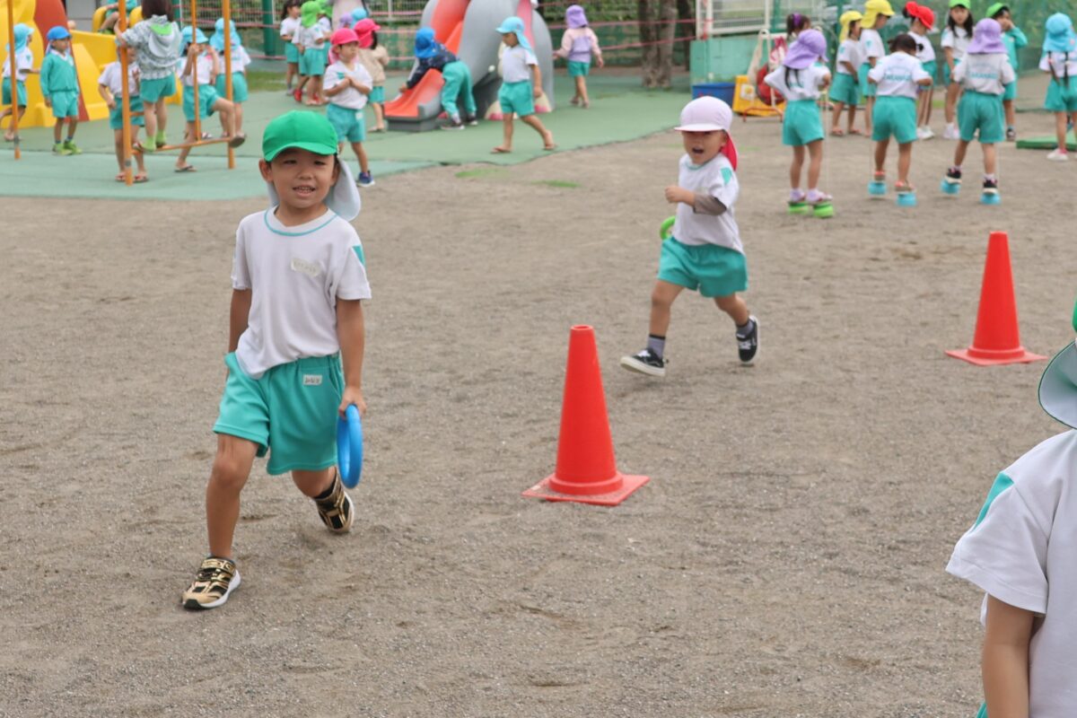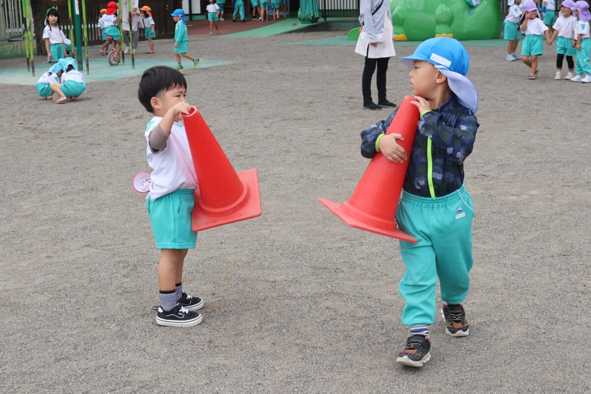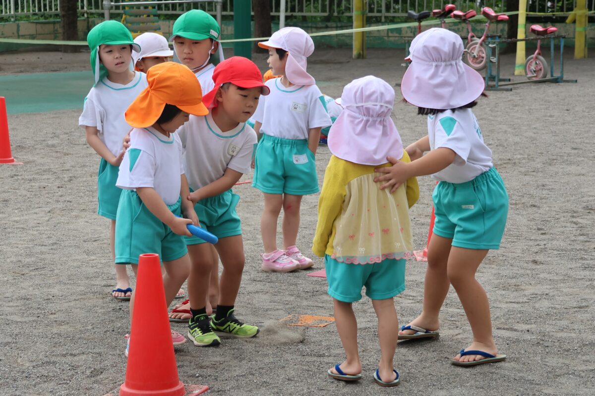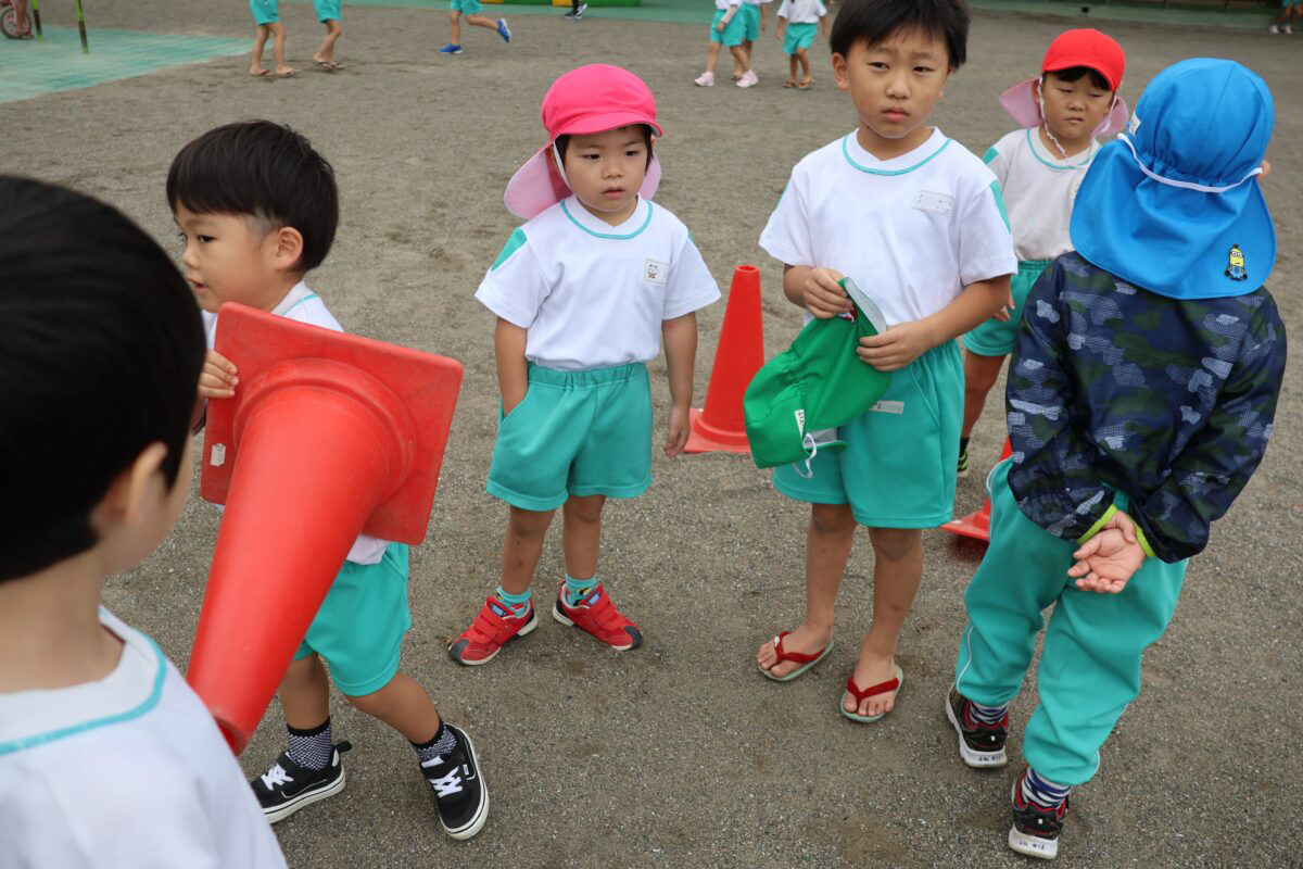 ①今日は待ちに待った涼しい日でした。早速園庭に出た年長さんはリレーの準備を始めます😄 ②三角コーンを持って来てトラックを作っていると… ③「貸して~!!」と年少さんが三角コーンを手にしています。年長さんは「何に使うの❓」と聞いてくれました😉 ④年少さんは「鉄棒に使いたい」ですって!!年長さんは「鉄棒には三角コーンは使わないと思うよ💦」と言いながらも… ⑤「1つなら大丈夫だな!!」と貸してくれて… ⑥空いてしまった三角コーンの間隔を調整してくれているのです!!「リレーで使っているよ!!」ではなく、年少さんに理由を聞いてその気持ちを汲んでくれる優しさが嬉しいですね💖 ⑦しばらくするとあっ!!先ほどの年少さんがリレーに参加しています!! ⑧バトンを受け取り嬉しそうに走り出すと… ⑨なんとグルグルと走り続け、4周目に突入です😁「待って~!!」と後ろから追いかける年長さん!! ⑩みんなも集まってきました。年長さんは「バトンを持って1周走ったら次の人に渡すんだよ!!」とリレーの説明をしてくれているのです😁 ⑪さらに無事に第一走者が走り出した後、お姉さんは次にバトンを受け取るお友達を誘導し… ⑫戻ってきたお友達のバトンパスを見守ってくれています😊 ⑬そして無事に次の走者を送り出すと… ⑭今度は戻ってきたお友達を列の最後尾へと連れて行ってくれたのです。✨ ⑮そんな頼もしいお姉さんがいてくれるので、後から来てくれた年少さんも… ⑯優しく教えてもらいながら… ⑰安心して参加する事が出来るのです🎵 ⑱お姉さんだけではありません!!もちろんお兄さんだって… ⑲年少さんにピッタリと付いて一緒に走ってくれていますよ💖見ているだけで周りも自然と笑顔が溢れる光景です✨ ⑳あっ!!一人で楽しく走っていた年少さんが転んじゃった💦 ㉑するとすぐに他のクラスの年少さんがやって来て、手を繋いで起こそうとしてくれているのです💖 ㉒そしてケガが無いかみんなが心配をしてのぞき込んでいますよ😆 ㉓でもご覧ください✨しばらくするとこの通り。また笑顔で走っていますよ💖みんなの思いやりのお陰でしょうね😍