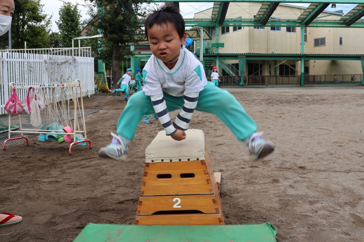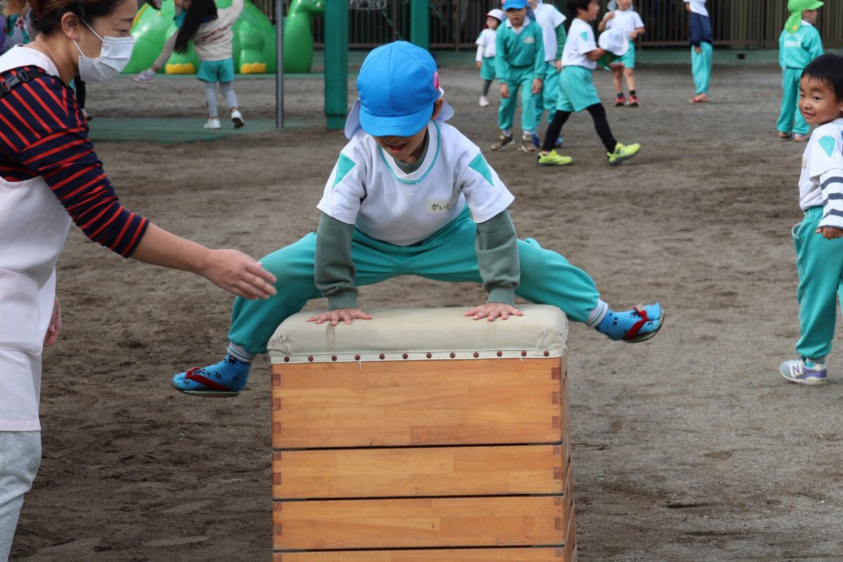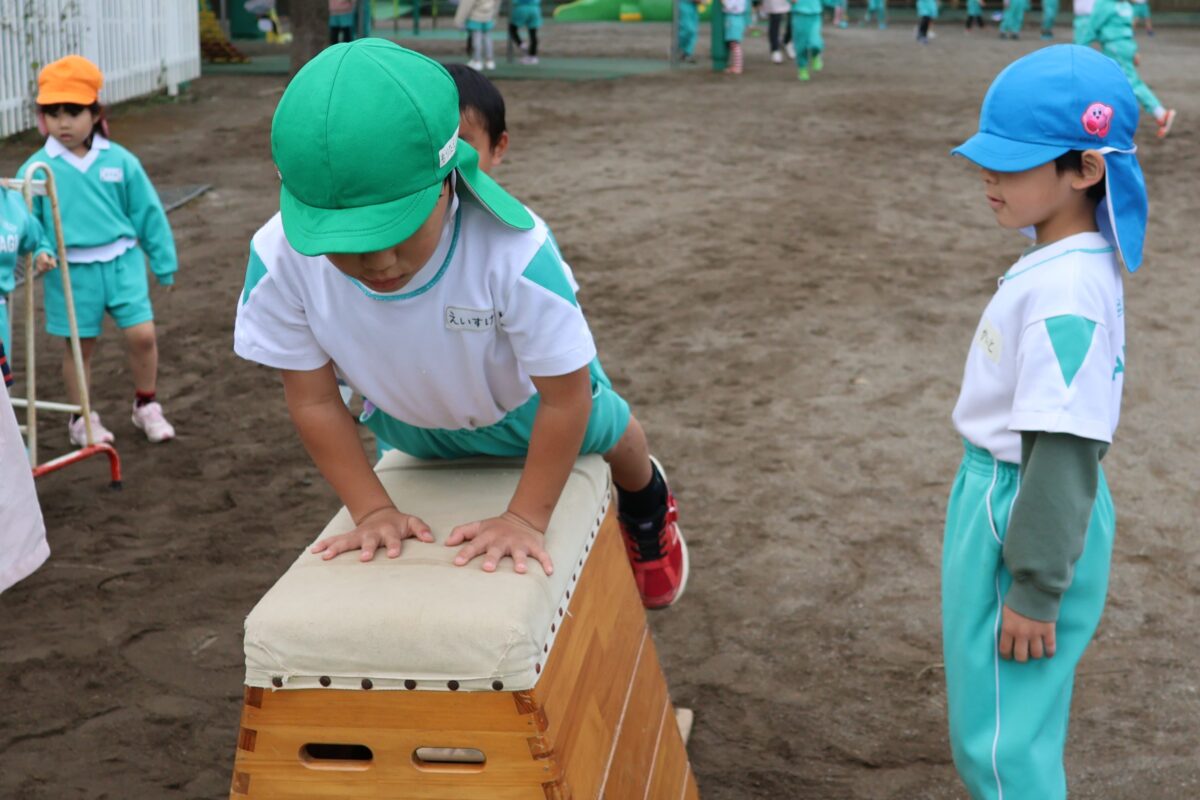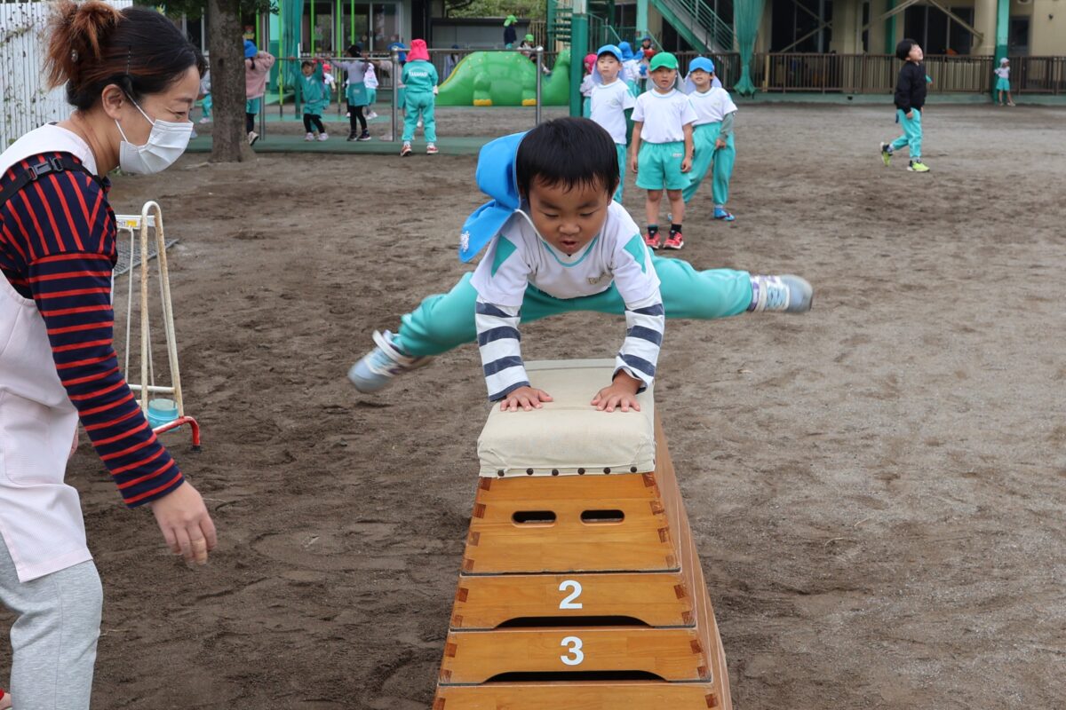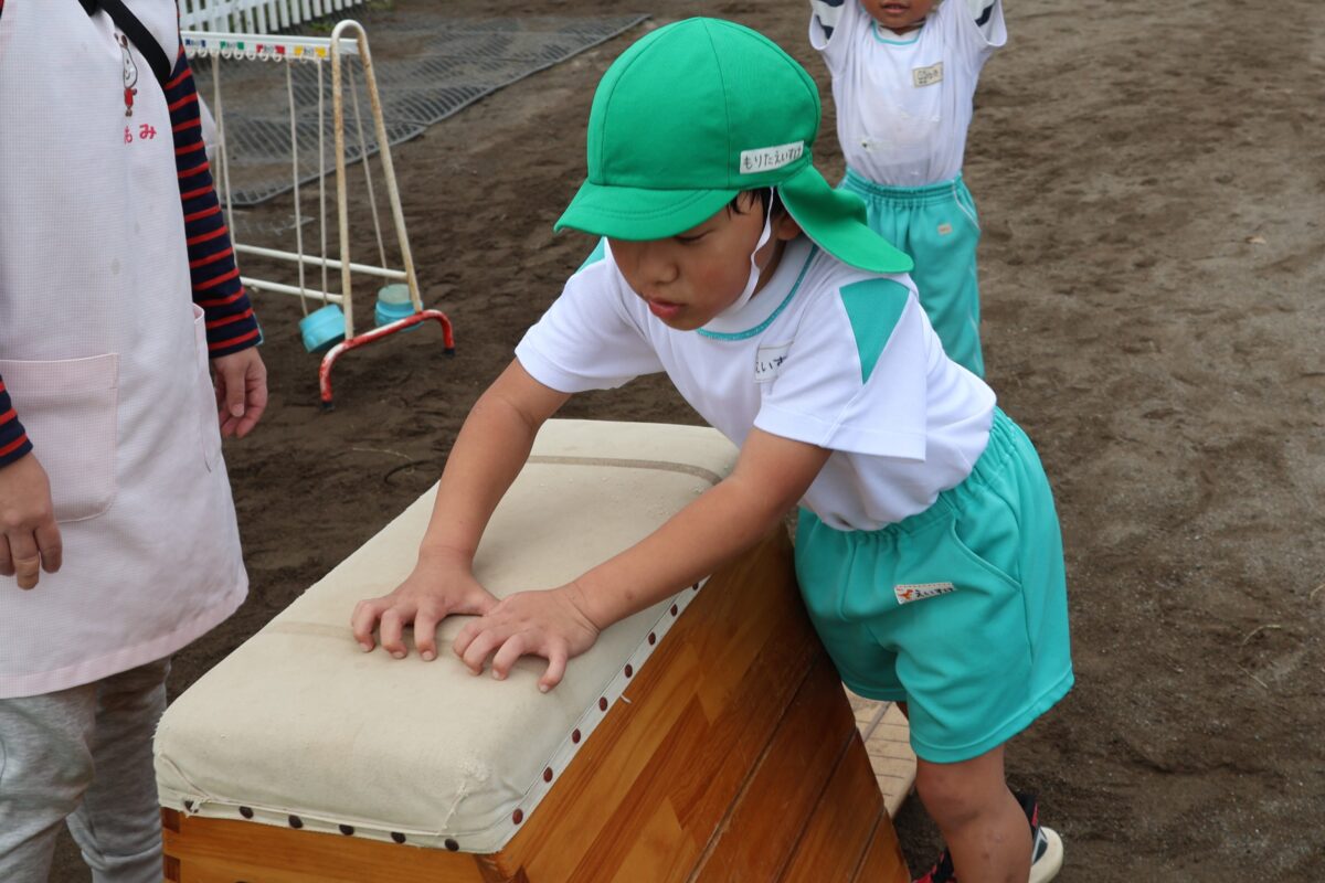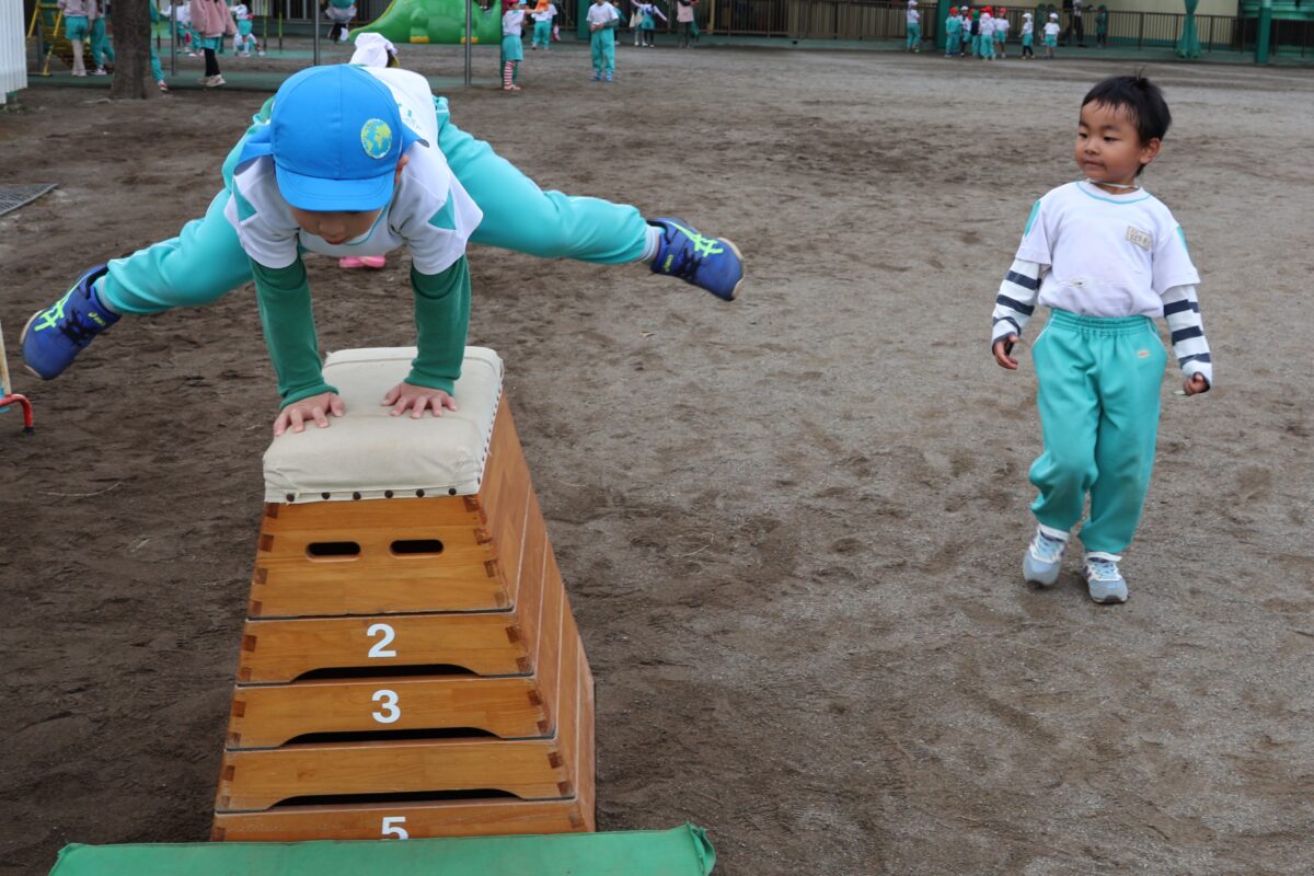①こちらでは跳び箱遊びが始まっています😉みんな足を大きく広げて上手に跳んでいますね🎵 ②しばらくするとみんなで相談をして跳び箱の向きを横から縦に変えました😄 ③向きが変わって跳ぶ距離が長くなった分、跳べるお友達もいますが… ④難しくなってしまったお友達も… ⑤「どうしたら跳べるかな❓❓」というスタッフからの問いかけに、跳べるお友達2人共が「手をもっと先につかないと跳べないよ!!」と教えてくれるのです😊 ⑥教えてもらった通りに手を、より先につくと・・・ ⑦それだけで座る位置に変化がみられました✨ ⑧更にこちらのお友達が言っています。「指がこうやって曲がっているとダメなんだよ!!」 ⑨「もっとパッとしたらいいんだよ!!」 ⑩確かに指を広げる事で体が安定します。 ⑪跳んでいる様子を見てくれていたお友達が、手のつき方を見て「いいね!!」と言っています😄誰かに認めてもらえると嬉しいですね💖 ⑫このように跳ぶ姿を見て、また気付く事があるようです!! ⑬「手をついたら前回りをするみたいにした方が良いよ!!」面白い表現ですが、頭を下げておしりを上げるという事のようです😆もっと体が前にいくように考えてアドバイスをしてくれました✨ ⑭あら❓❓お友達が遠い…自分で考えて助走の距離を変えたのです!! ⑮その結果…いい所まで来ました✨ ⑯あれ❓❓今度は2人で走って来ちゃった~💦間違えているよ!! ⑰そう思っていたのですが、お友達の跳び方を見るために並走していたのです😊「跳びたい!!」という強い気持ちが伝わってきますね🎵 ⑱お友達がついていた手の場所を再確認すると… ⑲先ほどより助走の距離を長くとり、勢いよく走り出しました😉 ⑳横から見ると、あと僅かな事が分かります!! ㉑しばらくすると高さを変えました😲 ㉒3段になった事でこちらの年長さんも縦向きで跳べるようになりました✨汗が流れるほど練習をしたこちらの年長さん。きっと今後5段でも跳べるようになった!!と嬉しい報告も聞こえて来るのではないでしょうか😉