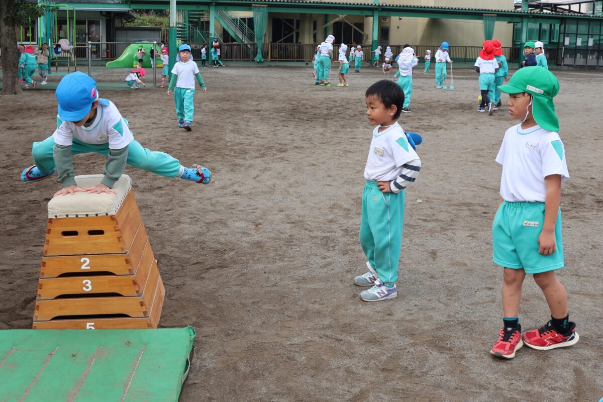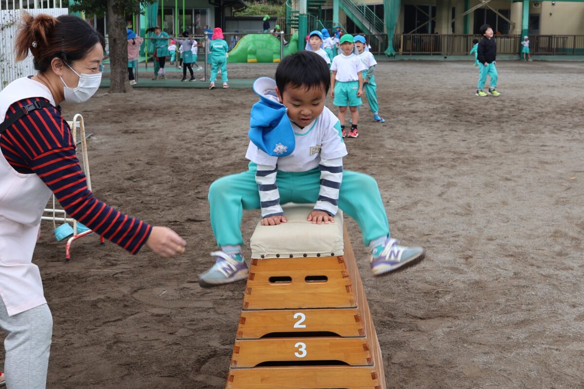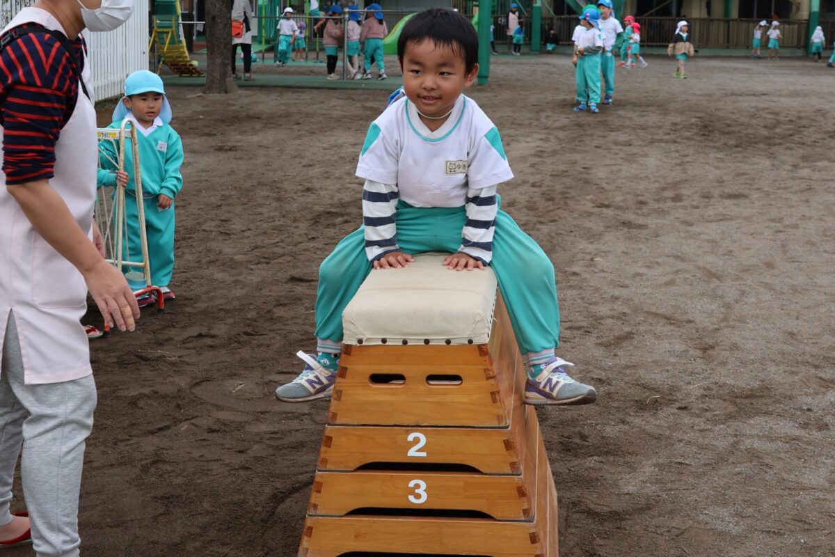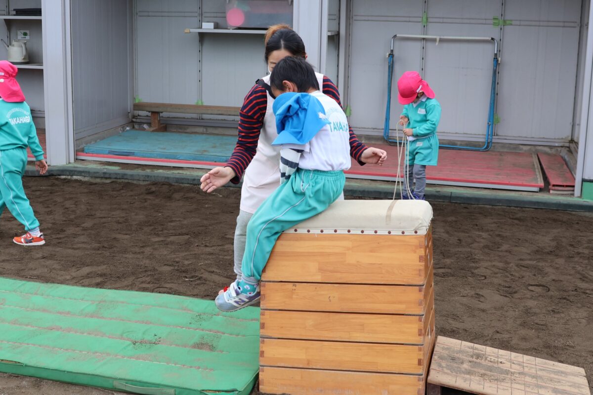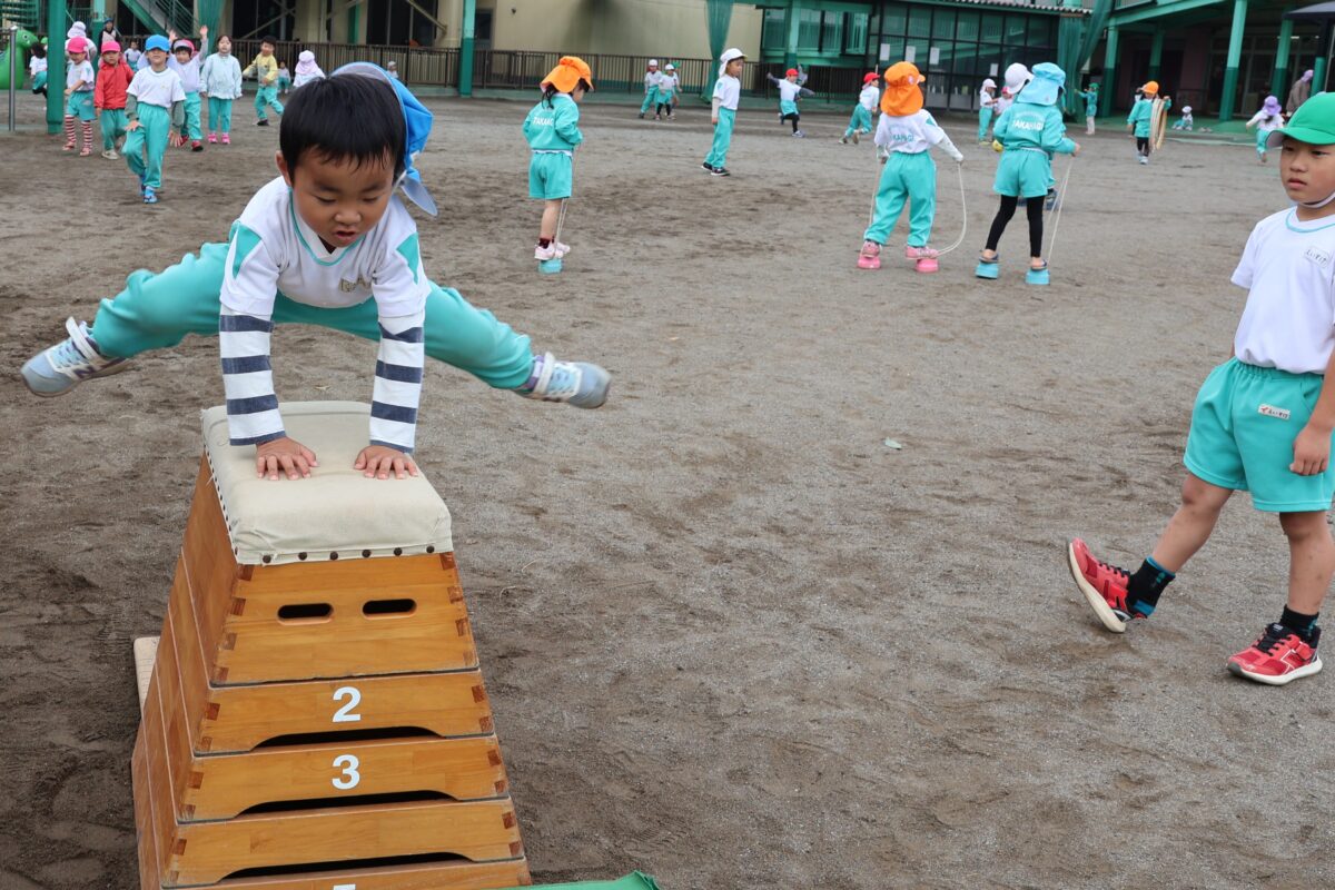 ①こちらでは跳び箱遊びが始まっています😉みんな足を大きく広げて上手に跳んでいますね🎵 ②しばらくするとみんなで相談をして跳び箱の向きを横から縦に変えました😄 ③向きが変わって跳ぶ距離が長くなった分、跳べるお友達もいますが… ④難しくなってしまったお友達も… ⑤「どうしたら跳べるかな❓❓」というスタッフからの問いかけに、跳べるお友達2人共が「手をもっと先につかないと跳べないよ!!」と教えてくれるのです😊 ⑥教えてもらった通りに手を、より先につくと・・・ ⑦それだけで座る位置に変化がみられました✨ ⑧更にこちらのお友達が言っています。「指がこうやって曲がっているとダメなんだよ!!」 ⑨「もっとパッとしたらいいんだよ!!」 ⑩確かに指を広げる事で体が安定します。 ⑪跳んでいる様子を見てくれていたお友達が、手のつき方を見て「いいね!!」と言っています😄誰かに認めてもらえると嬉しいですね💖 ⑫このように跳ぶ姿を見て、また気付く事があるようです!! ⑬「手をついたら前回りをするみたいにした方が良いよ!!」面白い表現ですが、頭を下げておしりを上げるという事のようです😆もっと体が前にいくように考えてアドバイスをしてくれました✨ ⑭あら❓❓お友達が遠い…自分で考えて助走の距離を変えたのです!! ⑮その結果…いい所まで来ました✨ ⑯あれ❓❓今度は2人で走って来ちゃった~💦間違えているよ!! ⑰そう思っていたのですが、お友達の跳び方を見るために並走していたのです😊「跳びたい!!」という強い気持ちが伝わってきますね🎵 ⑱お友達がついていた手の場所を再確認すると… ⑲先ほどより助走の距離を長くとり、勢いよく走り出しました😉 ⑳横から見ると、あと僅かな事が分かります!! ㉑しばらくすると高さを変えました😲 ㉒3段になった事でこちらの年長さんも縦向きで跳べるようになりました✨汗が流れるほど練習をしたこちらの年長さん。きっと今後5段でも跳べるようになった!!と嬉しい報告も聞こえて来るのではないでしょうか😉