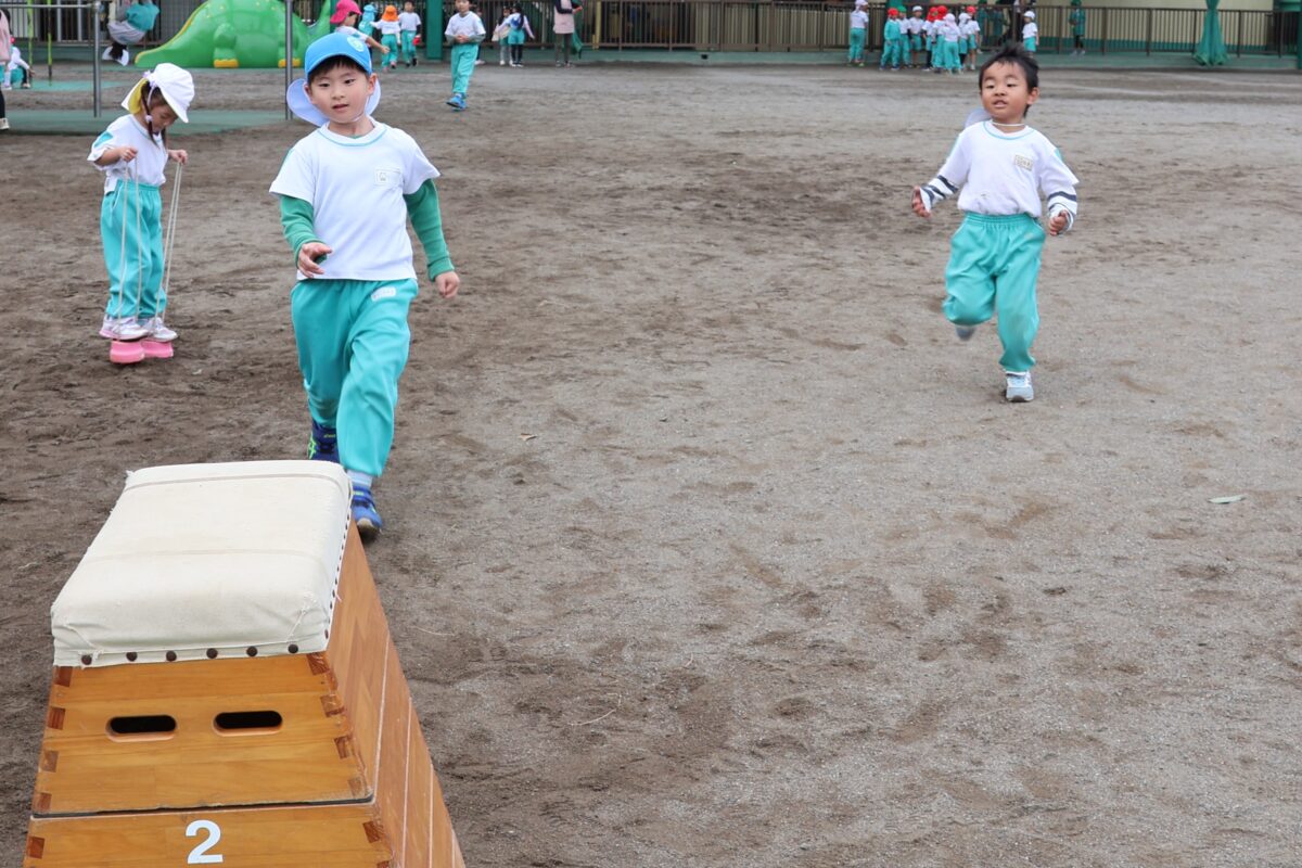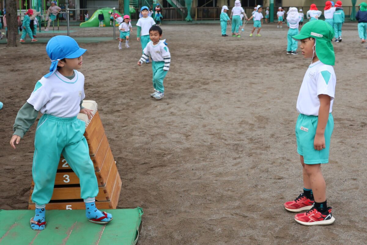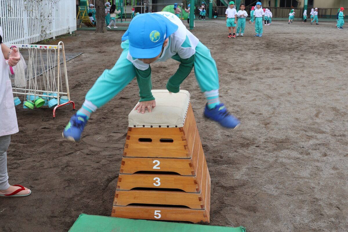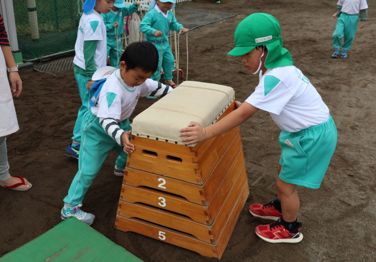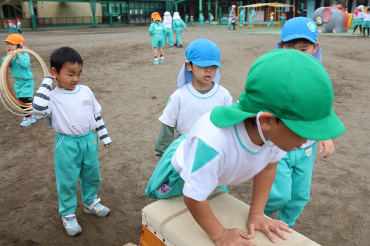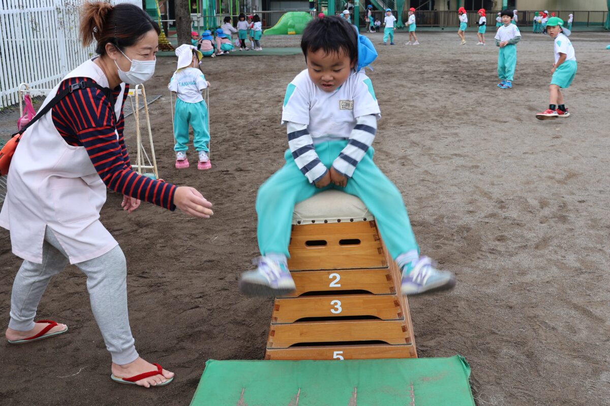 ①こちらでは跳び箱遊びが始まっています😉みんな足を大きく広げて上手に跳んでいますね🎵 ②しばらくするとみんなで相談をして跳び箱の向きを横から縦に変えました😄 ③向きが変わって跳ぶ距離が長くなった分、跳べるお友達もいますが… ④難しくなってしまったお友達も… ⑤「どうしたら跳べるかな❓❓」というスタッフからの問いかけに、跳べるお友達2人共が「手をもっと先につかないと跳べないよ!!」と教えてくれるのです😊 ⑥教えてもらった通りに手を、より先につくと・・・ ⑦それだけで座る位置に変化がみられました✨ ⑧更にこちらのお友達が言っています。「指がこうやって曲がっているとダメなんだよ!!」 ⑨「もっとパッとしたらいいんだよ!!」 ⑩確かに指を広げる事で体が安定します。 ⑪跳んでいる様子を見てくれていたお友達が、手のつき方を見て「いいね!!」と言っています😄誰かに認めてもらえると嬉しいですね💖 ⑫このように跳ぶ姿を見て、また気付く事があるようです!! ⑬「手をついたら前回りをするみたいにした方が良いよ!!」面白い表現ですが、頭を下げておしりを上げるという事のようです😆もっと体が前にいくように考えてアドバイスをしてくれました✨ ⑭あら❓❓お友達が遠い…自分で考えて助走の距離を変えたのです!! ⑮その結果…いい所まで来ました✨ ⑯あれ❓❓今度は2人で走って来ちゃった~💦間違えているよ!! ⑰そう思っていたのですが、お友達の跳び方を見るために並走していたのです😊「跳びたい!!」という強い気持ちが伝わってきますね🎵 ⑱お友達がついていた手の場所を再確認すると… ⑲先ほどより助走の距離を長くとり、勢いよく走り出しました😉 ⑳横から見ると、あと僅かな事が分かります!! ㉑しばらくすると高さを変えました😲 ㉒3段になった事でこちらの年長さんも縦向きで跳べるようになりました✨汗が流れるほど練習をしたこちらの年長さん。きっと今後5段でも跳べるようになった!!と嬉しい報告も聞こえて来るのではないでしょうか😉