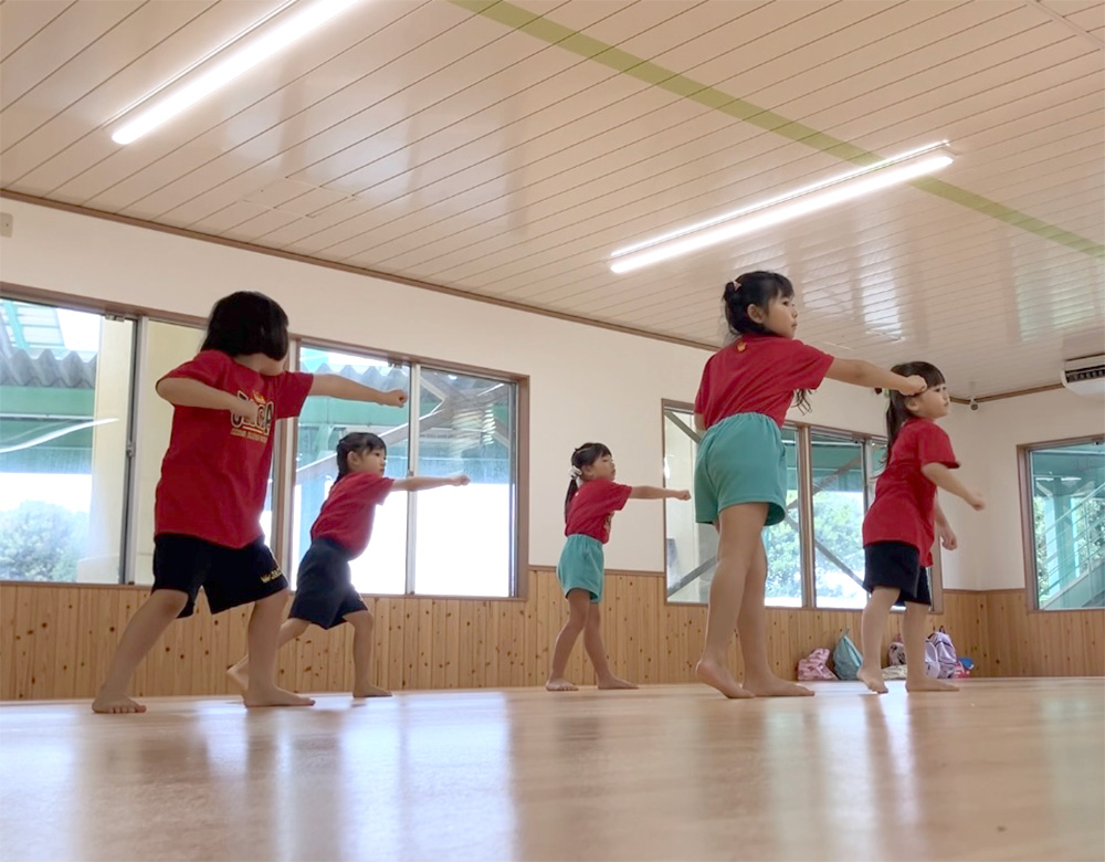 さまざまな動作をすることで、運動の楽しさと喜びを覚えながら身体の全般的な筋肉をつくり、柔軟性・反射神経・敏捷性・リズム感・バランス感覚を養うことができます。